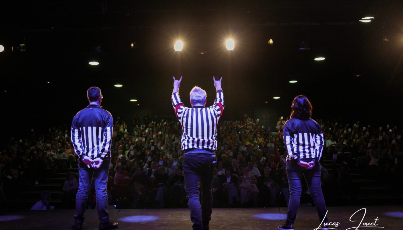 Un match d’impro c’est 2 équipes de comédien.es, 2 coach, un.e arbitre plu sou moins de bonne foi, des thèmes et le vote du public…